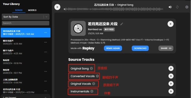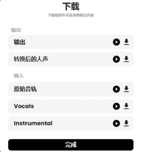 下载界面里的音频,依次是:翻唱后的人声+伴奏(如有)、翻唱后的干声、原始音频、原始音频中的干声、原始音频中的伴奏。