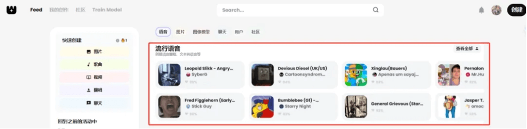 进入Weights官网(建议打开网页翻译功能),第一个板块就是超级多训练好的语音模型,直接免费用!点击查看全部,我们可以看到从虚拟角色到明星大佬,像海绵宝宝、迈克•杰克逊、霉霉、初音未来…挑起来真的是眼花缭乱。