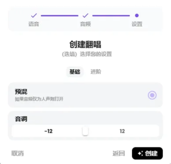 进阶的选项可以做一些更细致的调整,建议先用默认,如果生成的效果不满意,再进行微调。点击右下角的创建。